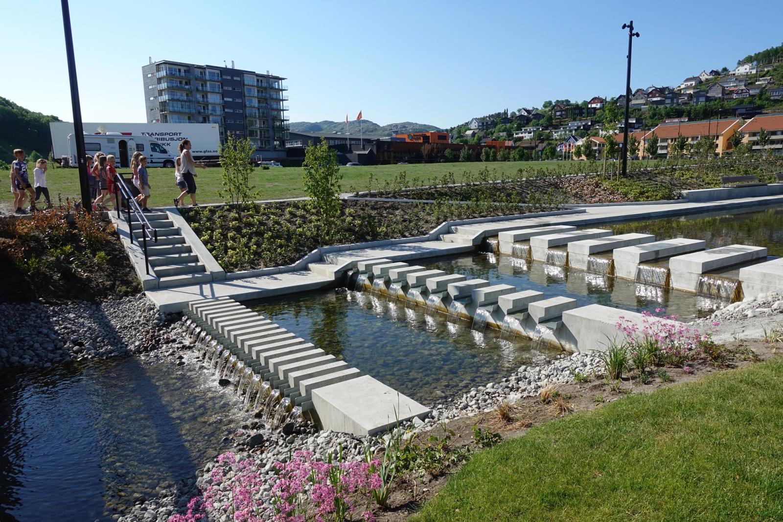Det nye torget og kanalparken har skapt et nytt sentrum i Ålgård. Figgjoelva er utviklet til en tverrgående kanal med terskler og vannspeil. Både dammene og tersklene er utformet slik at vannet endrer karakter og håndteres på ulike vis i sitt løp ned mot Figgjoelva. Vanntersklene er lave nok til at fisk kan svømme inn i kanalen. Øverst i kanalen ligger det største vannbassenget. Dette har fall ned mot et grunnere basseng, med sandstrand, som er tilrettelagt for plasking og lek for de yngste. Stranda er sørvestvendt og har gode solforhold. Gangveier, stier, bruer og hoppesteiner sørger for at man kan gå nesten over alt. Det er opparbeidet kanalstier med universell utforming og flere krysningsmuligheter, slik at man kommer tett på vannet. Rikelig med benker og sittemuligheter gjør kanalparken til et naturlig møtested.
